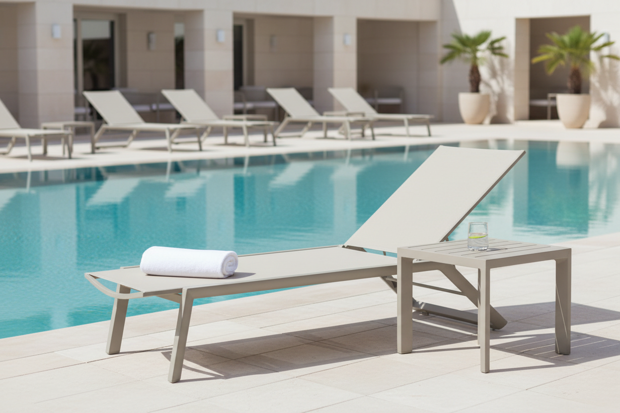 Aluminiowy leżak basenowy z 4-stopniową regulacją oparcia. Siedzisko i oparcie z materiału odpornego na promieniowanie UV, wilgoć i pleśń. Możliwość sztaplowania. Idealny do basenów hotelowych, tarasów i przestrzeni SPA. Malowany proszkowo farbami TIGER Coatings. Kolor szampańsko-beżowy.