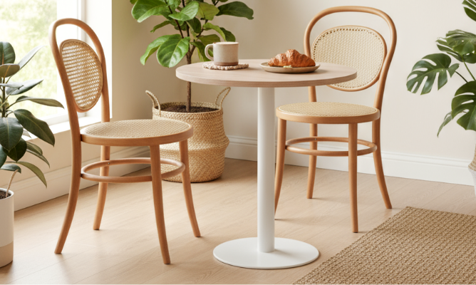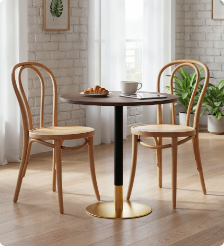 W połączeniu z krzesłami drewnianymi giętymi tworzą harmonijną przestrzeń,w której design spotyka się z komfortem i jakością.