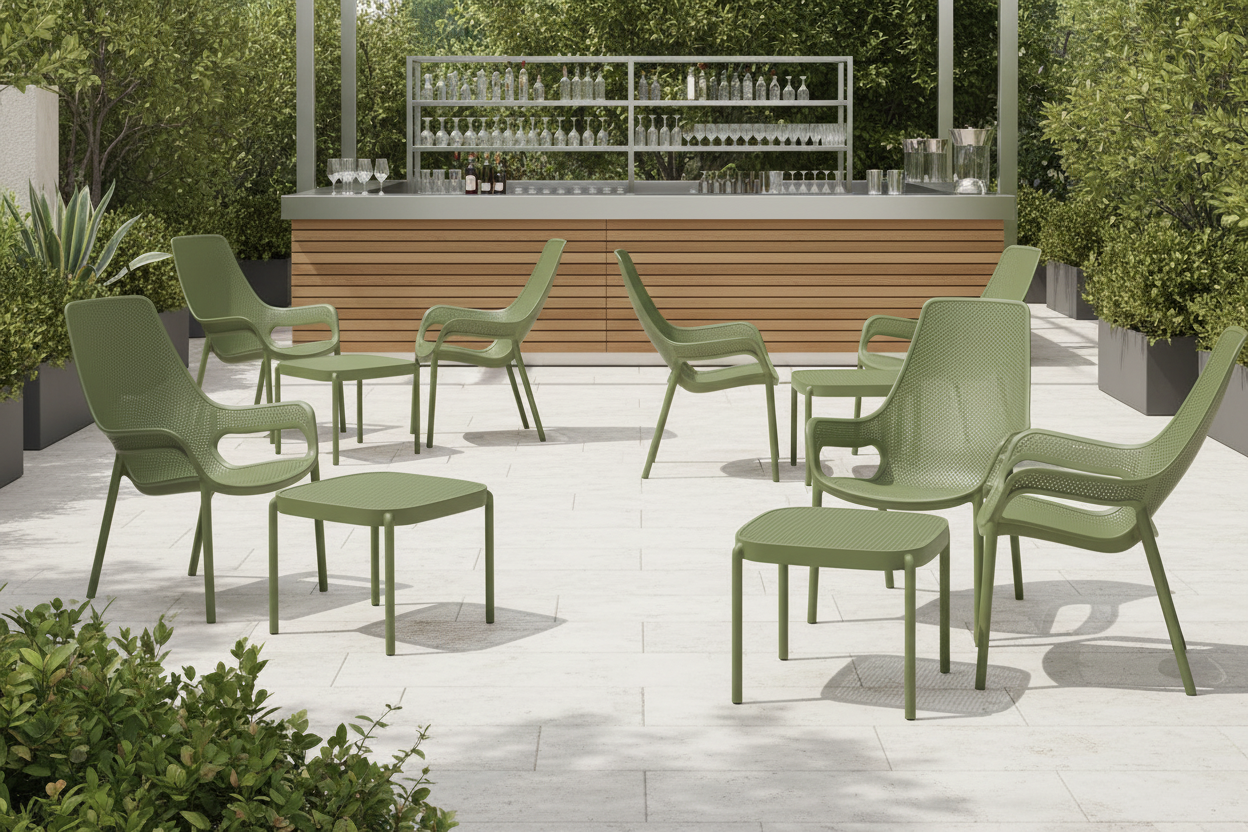 Zielone krzesło outdoorowe z podłokietnikami. Monolityczna forma bez łączeń. Odporne na promienie UV. Niska waga i możliwość sztaplowania.