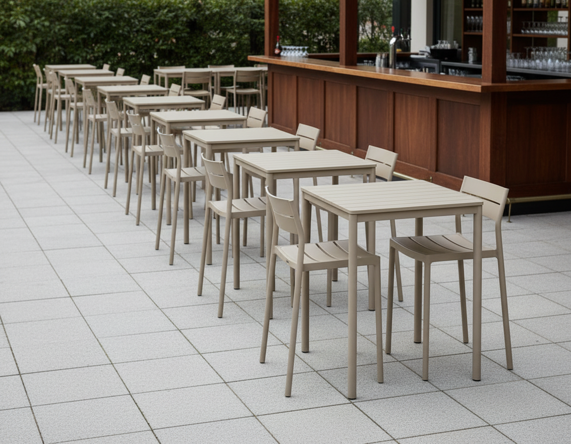 Krzesło plastikowe Capri w wersji przystosowanej do wyższych stolików barowych. Wysokiej jakości tworzywo sztuczne w kolorze beżowym, odporne na promienie UV. Możliwość sztaplowania. Nośność do 160 kg.