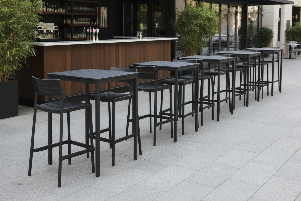 Krzesło plastikowe Capri w wersji przystosowanej do wyższych stolików barowych. Wysokiej jakości tworzywo sztuczne w kolorze czarnym, odporne na promienie UV. Możliwość sztaplowania. Nośność do 160 kg.