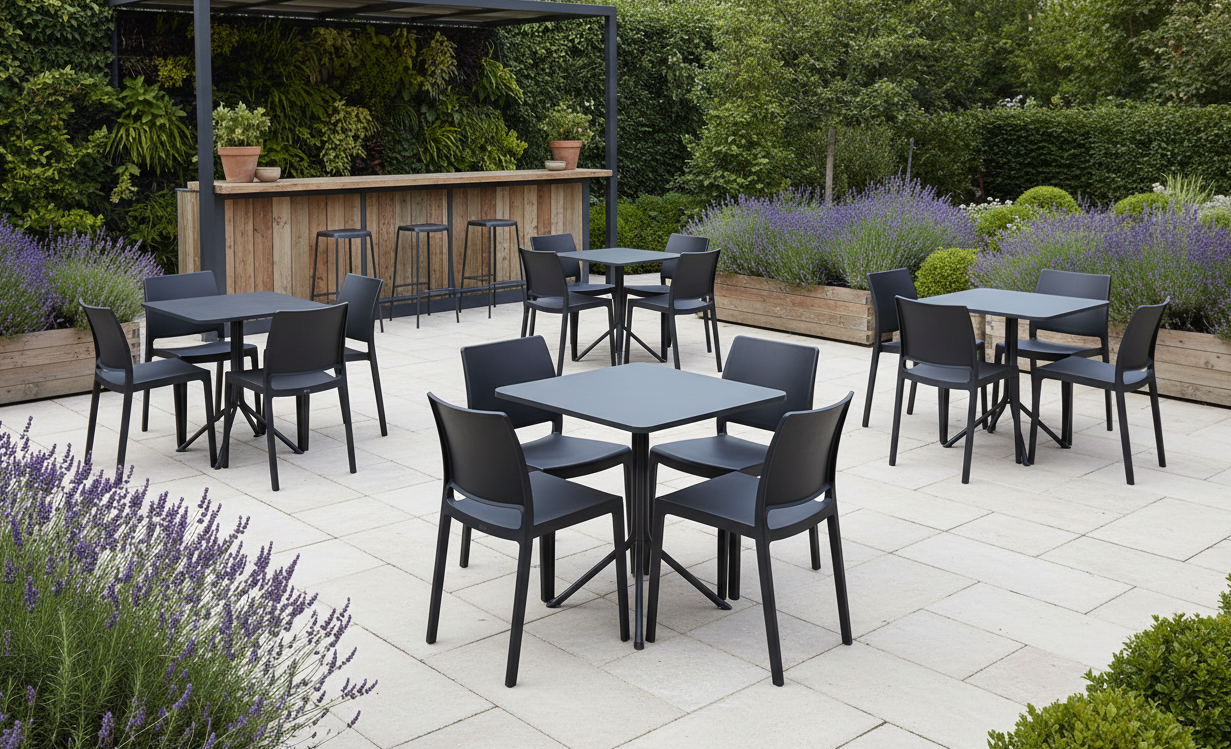 Krzesło do ogródków piwnych w kolorze czarnym. Odporne na intensywne użytkowanie w outdoorze. Nośność do 150 kg. Niska waga. Możliwość sztaplowania.