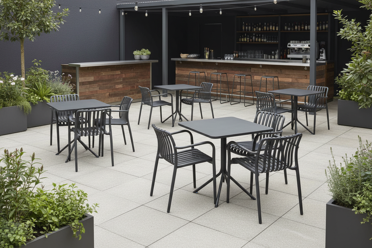 Krzesło outdoorowe w kolorze antracytowym, wykonane z wysokiej jakości tworzywa sztucznego. Lekka konstrukcja, umożliwiająca sztaplowanie. Nośność do 150 kg. Zintegrowane podłokietniki.