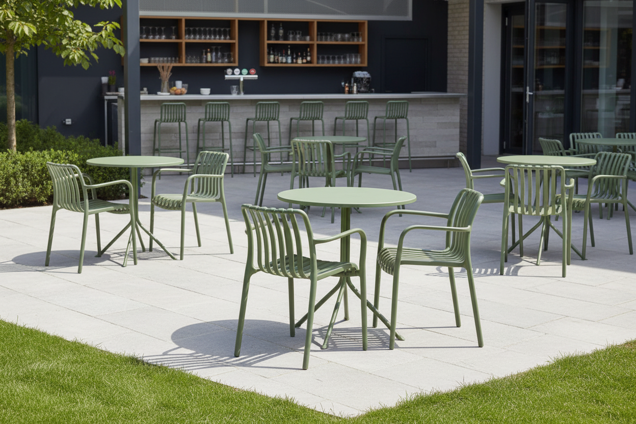 Krzesło outdoorowe w kolorze zielonym, wykonane z wysokiej jakości tworzywa sztucznego. Lekka konstrukcja, umożliwiająca sztaplowanie. Nośność do 150 kg. Zintegrowane podłokietniki.