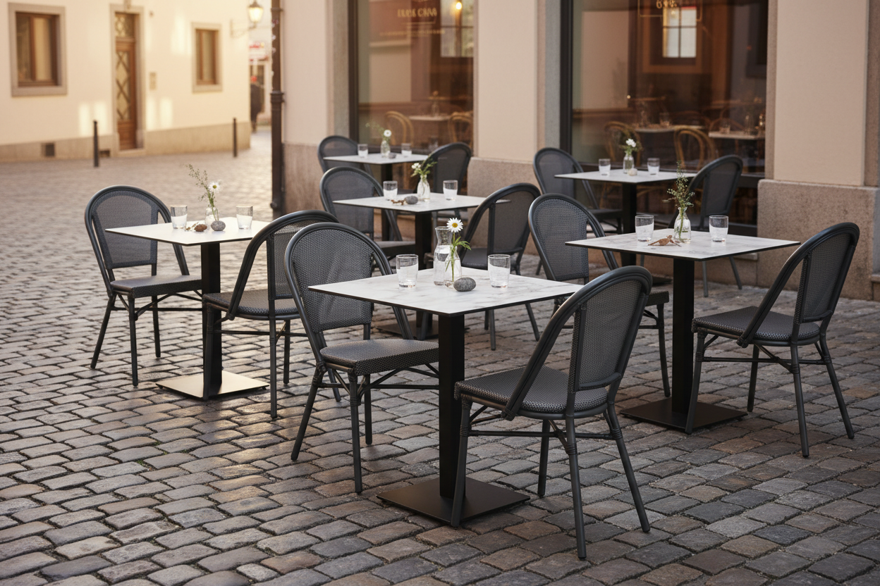 Krzesło technorattanowe, zaprojektowane z myślą o pracy w ogródkach gastronomicznych. Wytrzymała, lekka rama z aluminium. Dodatkowe wzmocnienie pod siedziskiem. Możliwość sztaplowania do 12 sztuk.