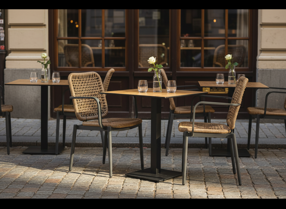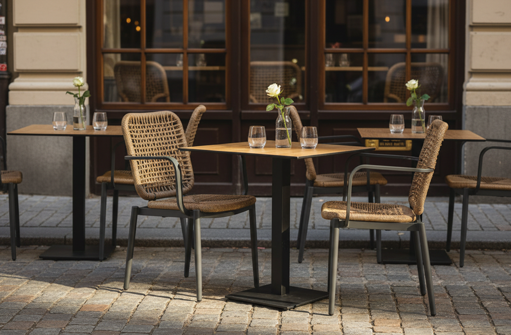 Krzesło technorattanowe o splocie Vortex. Aluminiowa rama ze ściankami o grubości 1,8 mm. Lekka konstrukcja, odporna na promienie UV. Możliwość sztaplowania. Wersja kolorystyczna z antracytową ramą oraz brązowym oparciem i siedziskiem.