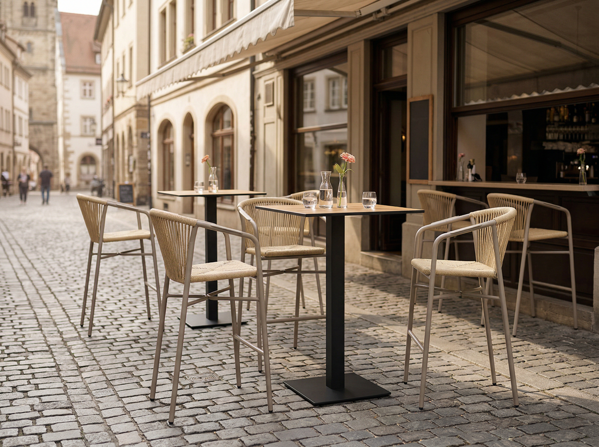 Krzesło technorattanowe Luigi Bar pozwala tworzyć funkcjonalne i atrakcyjne wizualnie strefy przy wysokich stolikach, które naturalnie przyciągają uwagę gości. Jego lekka forma nie dominuje przestrzeni, dzięki czemu dobrze sprawdza się tam, gdzie ważna jest swoboda poruszania się i szybka reorganizacja układu miejsc. Pozwala budować spójne aranżacje zarówno w nowoczesnych, jak i bardziej klasycznych konceptach gastronomicznych.