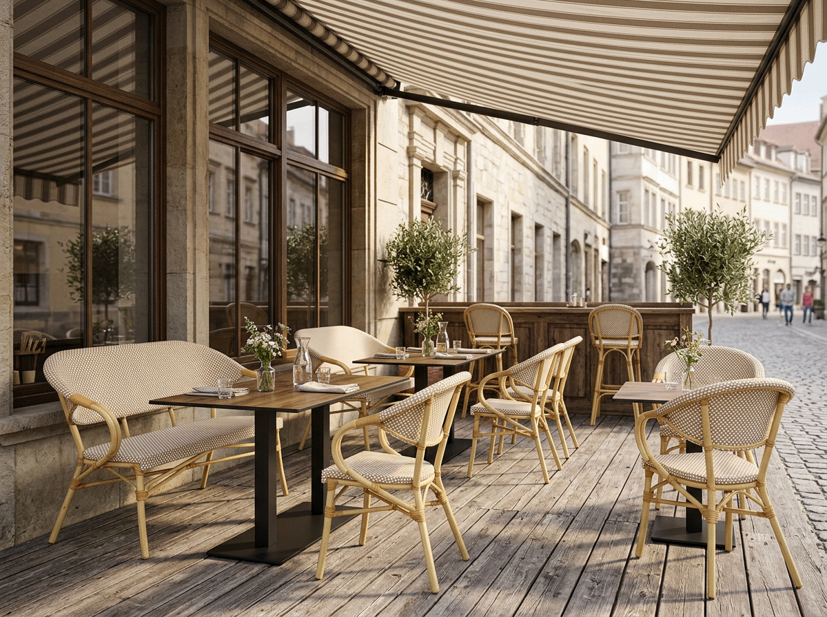 Ławka z podłokietnikami z brązowo-beżowym siedziskiem oraz oparciem z technorattanu. Aluminiowa rama w kolorze naturalnego drewna o grubości profilu 1,5 mm. Możliwość sztaplowania. Lekka konstrukcja o nośności do 250 kg.