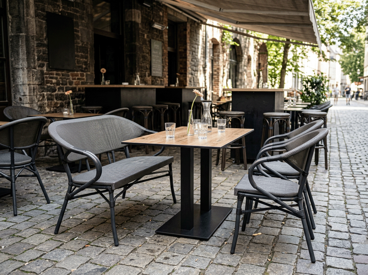 Ławka z podłokietnikami z czarno-grafitowym siedziskiem oraz oparciem z technorattanu. Aluminiowa rama w kolorze ciemnego antracytu o grubości profilu 1,5 mm. Możliwość sztaplowania. Lekka konstrukcja o nośności do 250 kg.