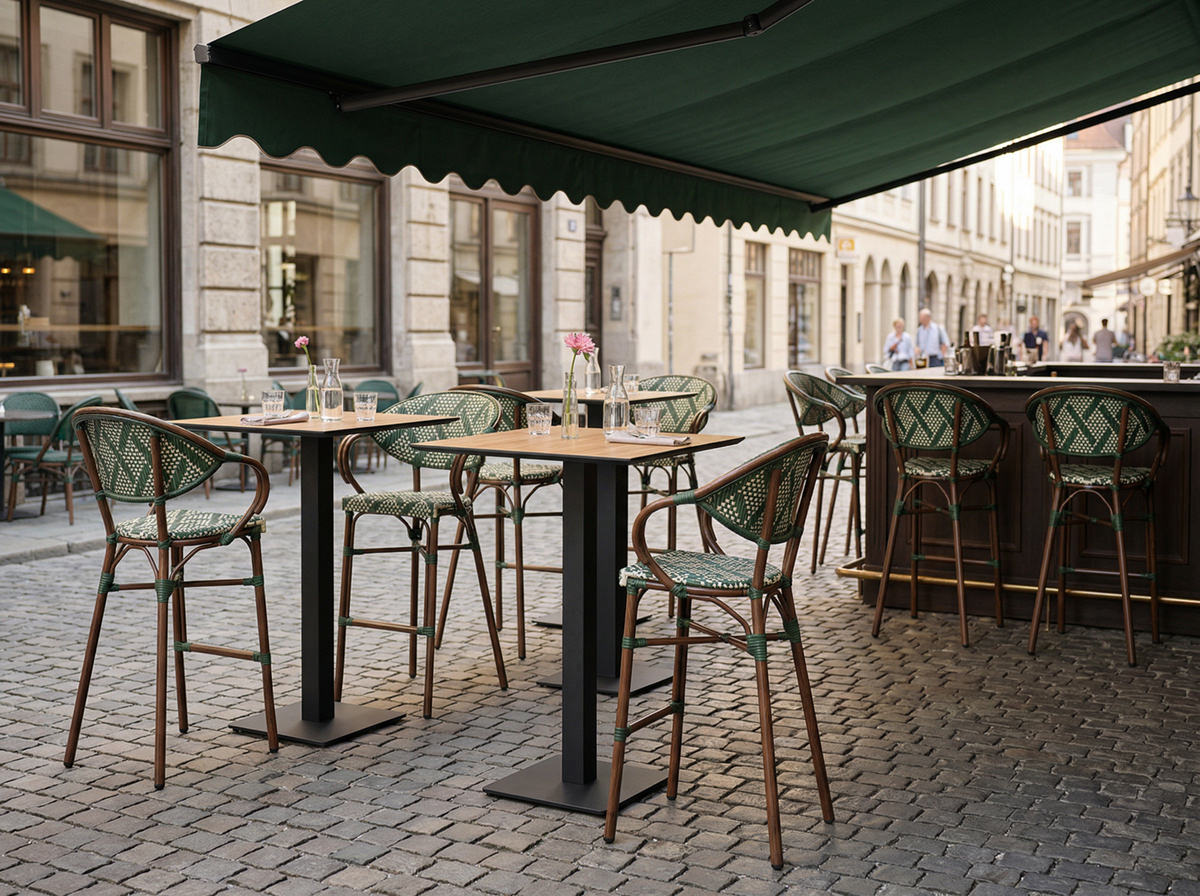 Krzesło outdoorowe z naciąganego ręcznie technorattanu w kolorze zielone. Aluminiowa rama o grubości profilu 1,8 mm malowana proszkowo na kolor orzechowy. Lekka, łatwa w przenoszeniu konstrukcja. Możliwość sztaplowania.
