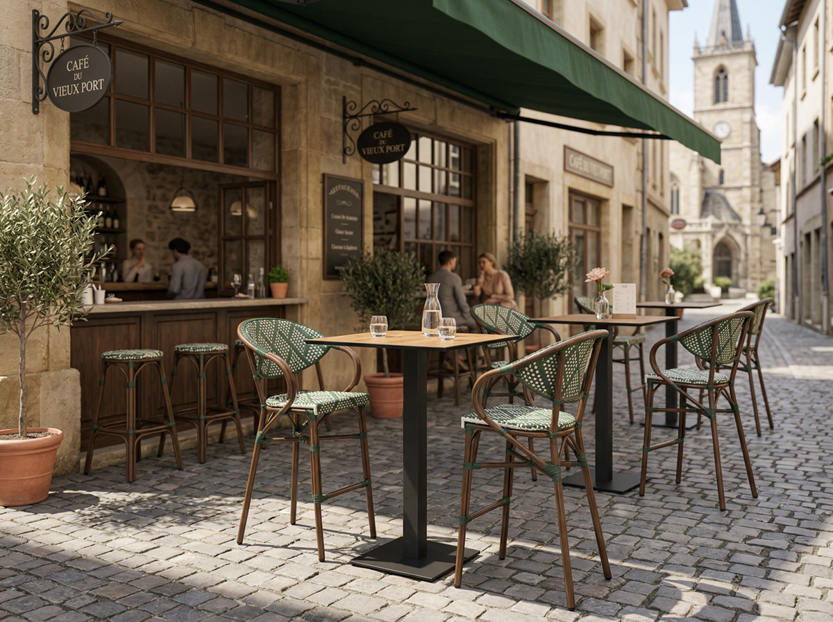 Krzesło outdoorowe z naciąganego ręcznie technorattanu w kolorze zielono-białym. Aluminiowa rama o grubości profilu 1,8 mm malowana proszkowo na kolor orzechowy. Lekka, łatwa w przenoszeniu konstrukcja. Możliwość sztaplowania.