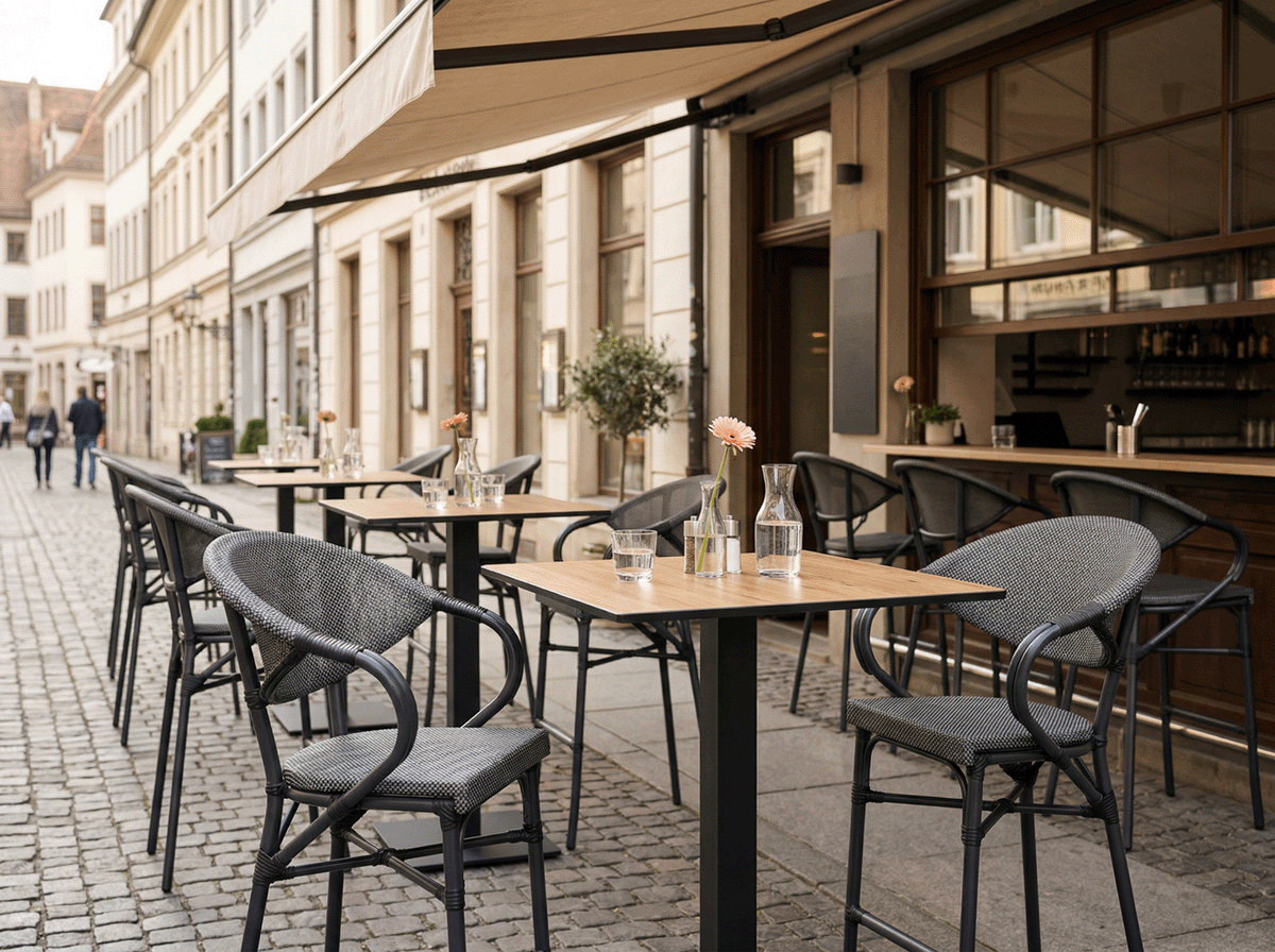Krzesło z siatką technorattanową w kolorze czarno-grafitowym. Wyższa, barowa forma z podłokietnikami. Rama wykonana z aluminium i pomalowana na kolor ciemnego antracytu. Lekka, sztaplowana konstrukcja. Nośność do 160 kg.
