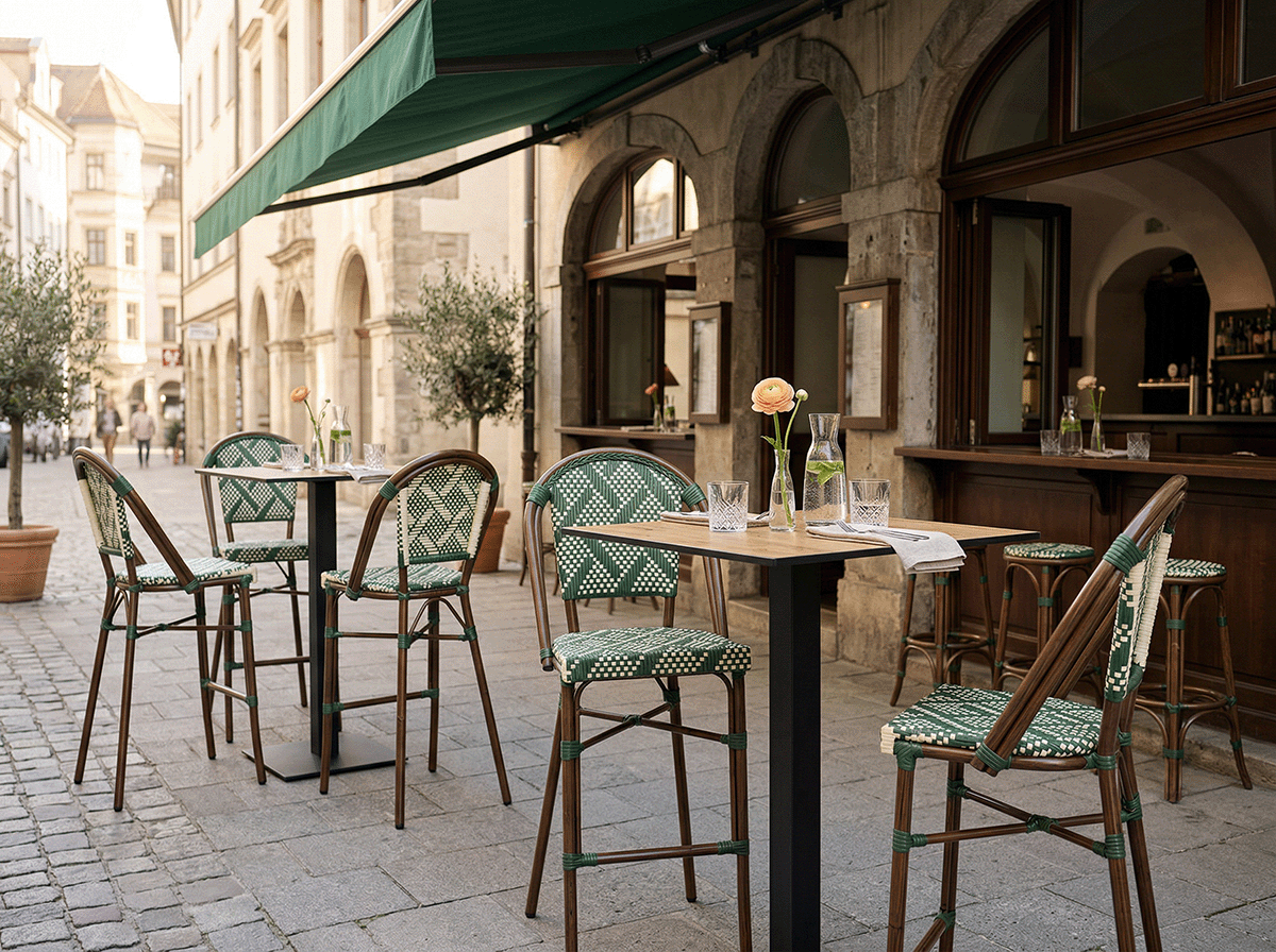 Krzesło z ręcznie plecionego technorattanu w kolorze zielono-białym. Forma pasująca do stolików barowych. Aluminiowa rama malowana proszkowo na kolor klonowy. Niska waga i wysoka wytrzymałość. Możliwość sztaplowania.