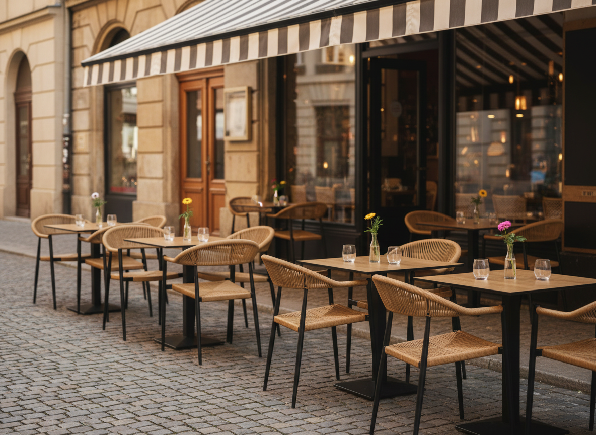 Krzesło technorattanowe z podłokietnikami z siedziskiem z wyplotem Vortex w kolorze ciemno-naturalnym. Aluminiowa rama o grubości ścianki 1,5 mm malowana proszkowo na kolor czarny. Lekka konstrukcja, ułatwiająca obsługę. Możliwość sztaplowania.