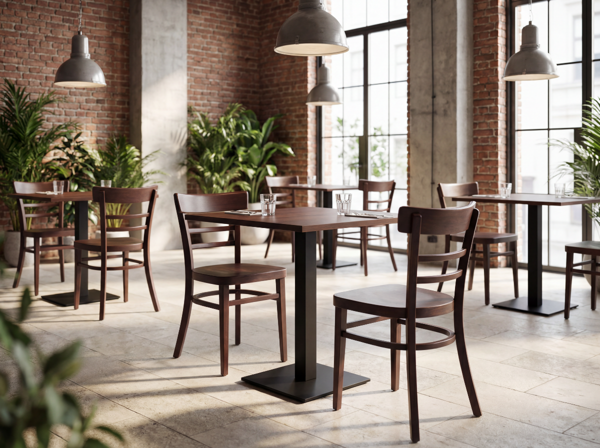 Minimalistyczne krzesło z giętego drewna bukowego, pochodzącego z certyfikowanych upraw FSC®. Klasyczna technika gięcia Michaela Thoneta. Kolor orzechowy.