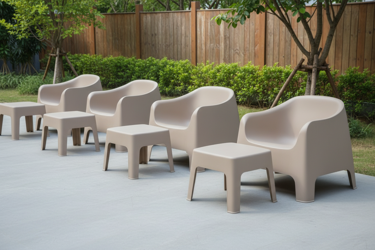 Plastikowy stolik do ogródków gastronomicznych w kolorze beżowym. Minimalistyczna konstrukcja, wykonana z trwałego tworzywa sztucznego, odpornego na promienie UV. Możliwość sztaplowania.