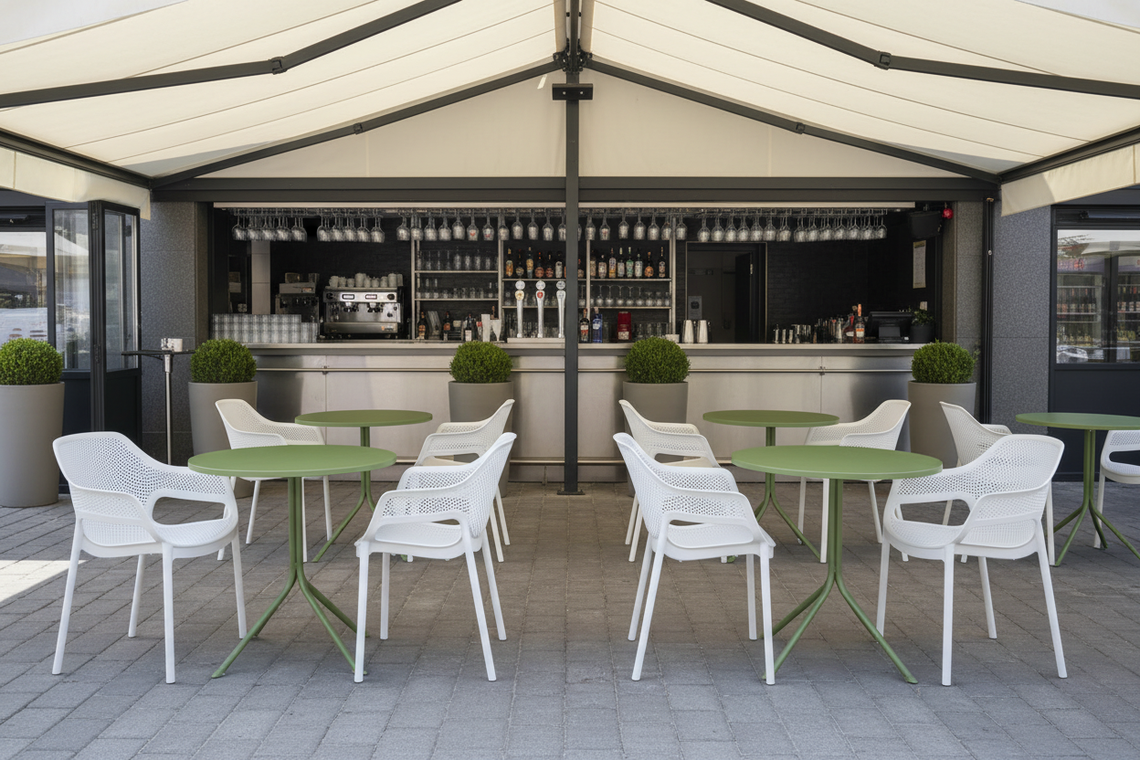 Stolik outdoorowy z okrągłym blatem z wytrzymałego tworzywa sztucznego. Rama ze stali nierdzewnej malowanej proszkowo i zabezpieczonej powłoką e-coating. Idealny do ogródków piwnych, patio, tarasów i innych przestrzeni na zewnątrz. Kolor zielony.