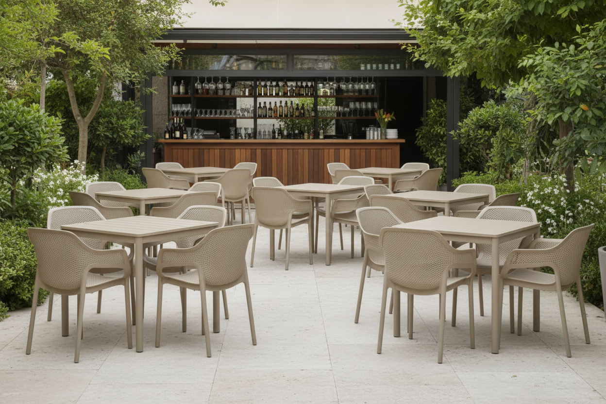 Stolik gastronomiczny outdoorowy w kolorze beżowym. Wykonany z wysokiej jakości tworzywa sztucznego, odpornego na promieniowanie UV. Rama ze stali nierdzewnej malowanej proszkowo i zabezpieczonej powłoką e-coating.