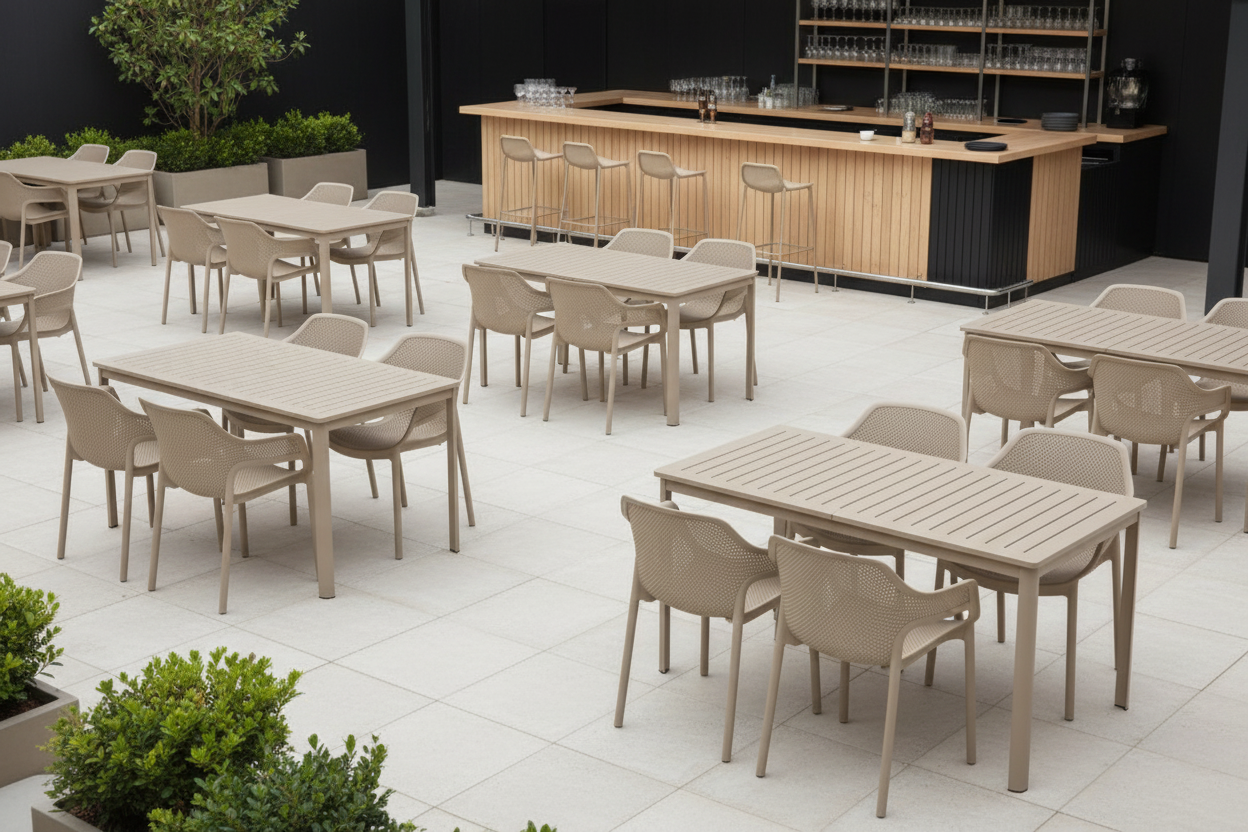 Stolik do ogródków gastronomicznych z blatem z polipropylenu wzmocnionego włóknem szklanym. Odporny na promienie UV. Rama ze stali nierdzewnej malowanej proszkowo, zabezpieczonej powłoką e-coating. Kolor beżowy.
